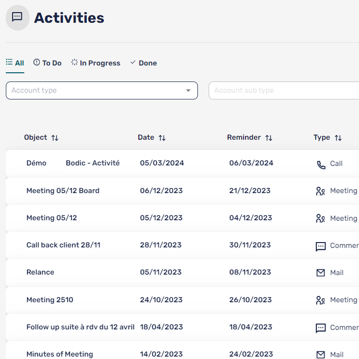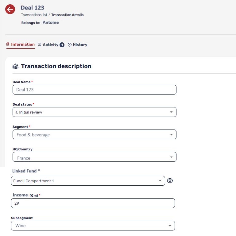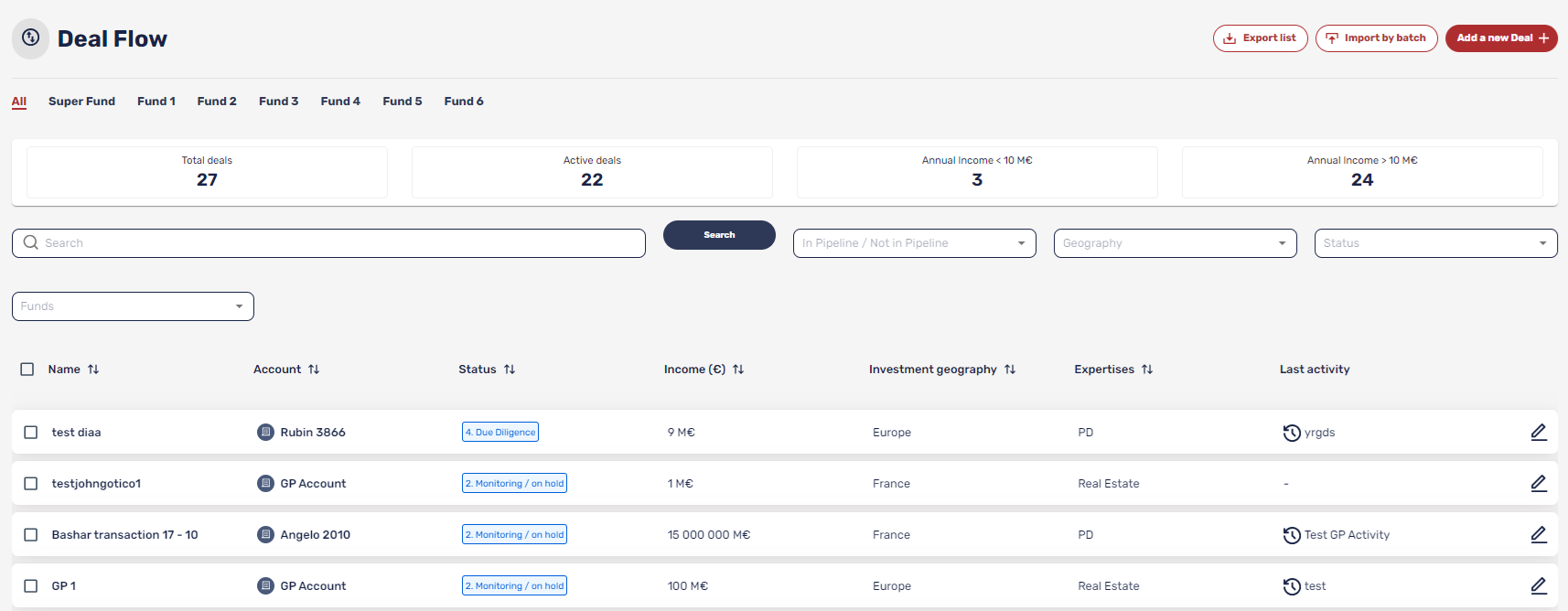 Un suivi structuré et collaboratif de vos opportunités. Centralisez, qualifiez et pilotez vos opportunités d’investissement grâce à un outil pensé pour les sociétés de gestion.