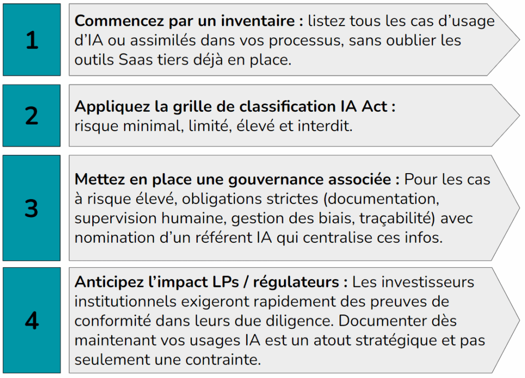 - Se préparer tôt, c’est éviter des sanctions lourdes (jusqu’à 35 M€ ou 7 % du CA mondial) et renforcer son attractivité auprès des LPs.