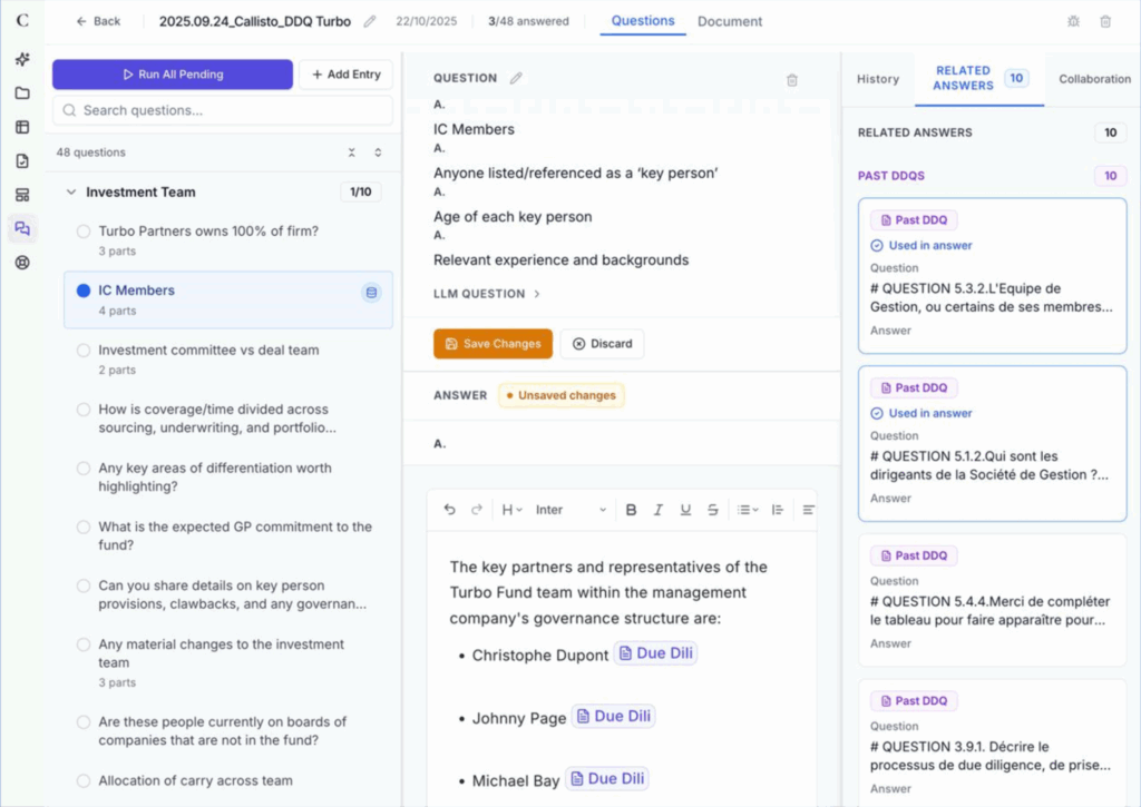 Callisto permet de répondre aux DDQ et reportings directement dans le format des LPs, via une interface dédiée.